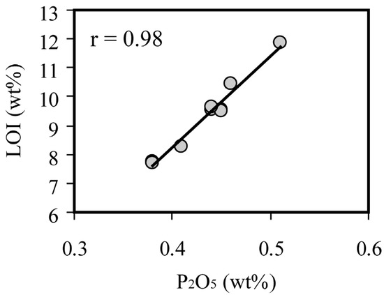 The SiO2/Al2O3 ratios in the Vali–Janlou kaolin ores vary from 2.70 to 3.65. This range of values is much higher than those of corresponding values in typical kaolin ores (0.992–1.082) [57]. This discrepancy in SiO2/Al2O3 ratios may be due to the presence of considerable free silica (quartz) and silicate mineral phases in the Vali–Janlou kaolin ores. The total proportion of Fe and Ti components (Fe2O3 + TiO2) in the Vali–Janlou kaolin ores changes from 0.66 wt% to 1.77 wt% (mean of 0.85 wt%). By taking into consideration that the total proportions of Fe2O3 + TiO2 with <1 and >1 for kaolin ores are indicative of hypogene and supergene processes, respectively [4], it can be deduced that hypogene (relative to supergene) processes played a prominent role in the development of the Vali–Janlou kaolin deposit. This deduction is further favored by the strong positive correlation between P2O5 and LOI (r = 0.98) (Figure 4), as such correlation values can be conspicuous characteristics of Kaolin deposits with a hypogene nature [58].