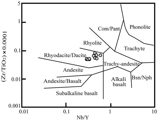 Bivariate diagram of Zr/TiO2 versus Nb/Y [64] in which the data points of the studied samples from the Vali–Janlou kaolin deposit lie within the field of rhyodacitic/dacitic precursor rocks.