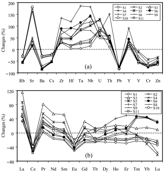 Low-mobile index element: Elements like Al, Zr, Nb, Ta, and Ti display the least degree of mobility during alteration processes in volcanic rocks [63,64,65,66]. In this study, Ti, due to its low variation (in concentration value) relative to the other elements (Ta, Nb, Zr, and Al), was selected as a low-mobile index element. The results obtained from calculations of the trace element mass balance (by applying the above equation) are shown in Figure 6a,b. In these calculations, the positive and negative values indicate the degree of mass loss and mass gain of the trace elements, respectively, during the development of the Vali–Janlou kaolin deposit. The results of these calculations also revealed that the kaolinization of the rhyodacitic rocks was accompanied by the enrichment of Sr, Zr, Hf, Ta, Nb, U, Th, Y, La, and Pr, leaching–fixation of Sm, Nd, and HREEs, and depletion of Rb, Cs, Ba, Pb, V, Cr, Zn, Eu, and Ce.