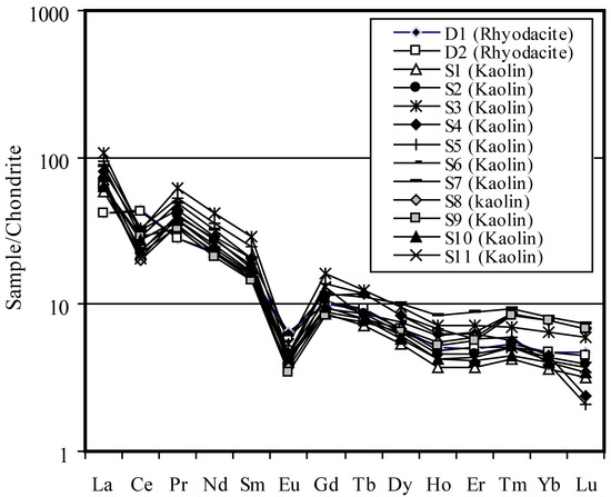 Distribution pattern of REEs normalized to chondrite [74] in the kaolin and rhyodacitic rock samples at Vali–Janlou delineating the differentiation and enrichment of LREEs relative to HREEs as well as the occurrence of negative Eu and Ce anomalies in the kaolin samples.