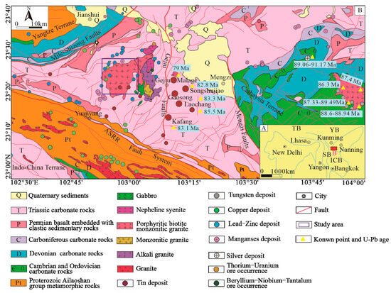 Simplified geotectonic map of Gejiu region, China. (A) Map showing tectonic units of Gejiu tin polymetallic cluster, in relation to regional geological background for this part of Southeast Asia [9]. (B) Geological map of area illustrating spatial location of plutonic intrusions and ore deposit types in study area [10]. CB—Cathaysia Terrane; ICB—Indo-China Terrane; SB—Sibumasu Terrane; TP—Tibet Plate; YB—Yangtze Terrane.