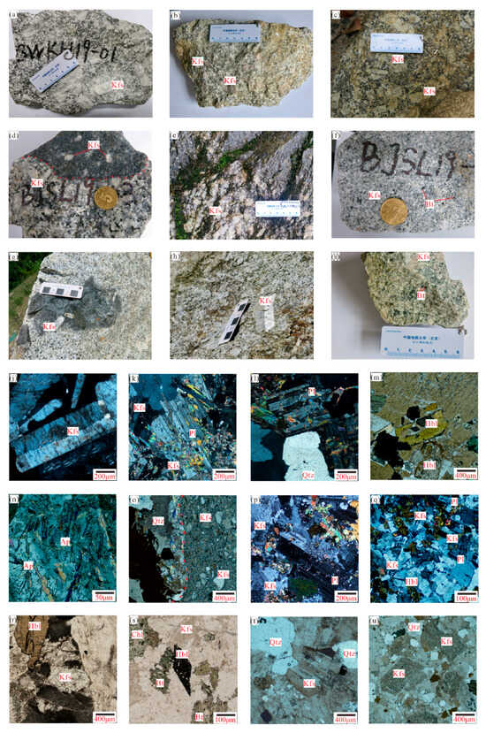 Hand specimen and photomicrographs of representative granitic rocks in Longchahe pluton. (a) The photo of Wukehe porphyritic granite; (b) The photo of Songshulin porphyritic granite; (c) The photo of Luchaichong porphyritic granite; (d) The photo of Jiashilong porphyritic granite (The red dotted line is the boundary between granite and inclusions); (e) The photo of Jiashilong porphyritic granite; (f) The photo of Jiashilong medium-grained granite; (g) The photo of Banggan porphyritic granite (included inclusions); (h) The photo of Banggan porphyritic granite; (i) The photo of Bangganxi porphyritic granite; (j) Wukehe porphyritic granite XPL image; (k) Songshulin porphyritic granite XPL image; (l) Songshulin porphyritic granite XPL image; (m) Luchaichong porphyritic granite XPL image; (n) Luchaichong porphyritic granite XPL image; (o) Jiashilong porphyritic granite XPL image (The red dotted line is the boundary between granite and inclusions); (p) Jiashilong porphyritic granite XPL image; (q) Jiashilong medium-grained granite XPL image; (r) Songshulin porphyritic granite PPL image; (s) Luchaichong porphyritic granite PPL image; (t) Banggan porphyritic granite PPL image; (u) Bangganxi porphyritic granite PPL image. Abbreviations: Kfs = K–feldspar; Pl = plagioclase; Qtz = quartz; Bt = biotite; Hbl = hornblende; Ap = apatite; Chl = Chlorite; XPL = Crossed Polarized Light; PPL = Plain Polarized Light.