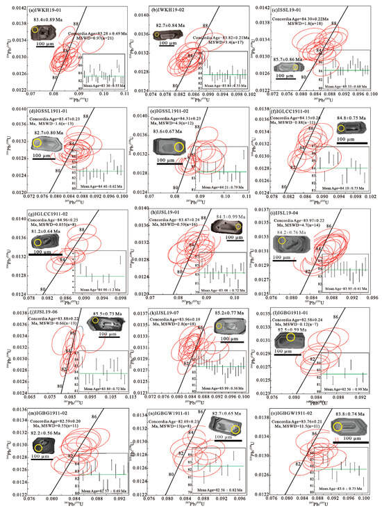 The zircon found in the grey-white megacryst porphyritic granites, IGBG1911 and IGBGW1911, located in Banggan and Bangganxi, are euhedral to subhedral crystals that appear light yellow or colourless. These grains have relatively low U (360–4001 ppm) and Th (174–2362 ppm) contents, with Th/U ratios ranging from 0.20 to 1.28. The presence of clear oscillatory zoning under CL imagery is indicative of magmatic zircon (see Figure 4). The calculated concordant ages of two samples from Banggan are 82.58 ± 0.24 Ma (N = 7, MSWD = 0.12; Figure 4l) and 82.59 ± 0.20 Ma (N = 11, MSWD = 0.55; Figure 4m), respectively. The calculated concordant ages of two samples from Bangganxi were determined to be 82.69 ± 0.23 Ma (N = 8, Figure 4n) and 83.76 ± 0.21 Ma (N = 11; Figure 4o), respectively.