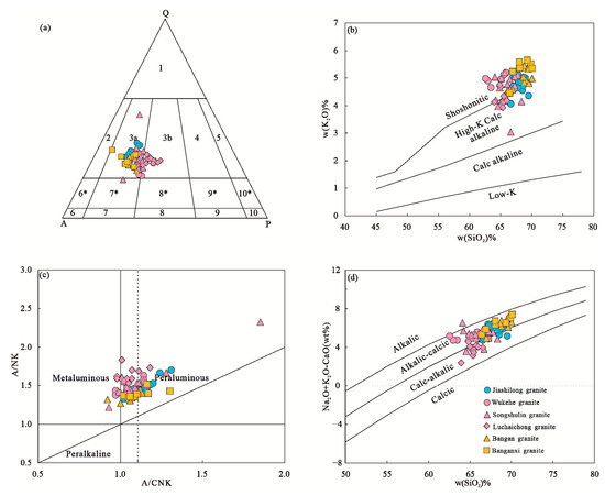 Geochemical characteristics of Longchahe granitic rocks. (a) QAP diagram [28] (1—quartz-rich granite; 2—alkali feldspar granite; 3a—granite; 3b—monzonitic granite; 4—granodiorite; 5—quartz diorite, plagiogranite; 6*—alkali feldspar syenite; 7*—quartz syenite; 8*—quartz monzonite; 9*—monzonitic quartz diorite; 10*—quartz diorite; 6—alkali syenite; 7—syenite; 8—monzonite; 9—monzonitic diorite; 10—diorite); (b) K2O vs. SiO2 diagram [29]; (c) A/NK vs. A/CNK diagram [30]; (d) (Na2O + K2O–CaO) vs. SiO2 diagram [31].