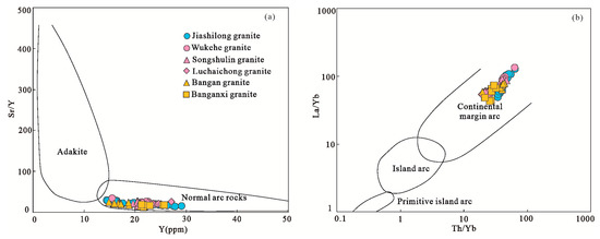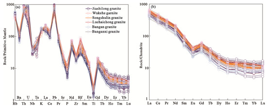 (a) Primitive mantle-normalised trace element diagram for Longchahe pluton; (b) chondrite-normalised REE diagram [32].