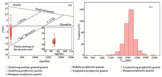 (a) εHf(t)—age (Ma) plot [33]; (b) TDMC(Hf) statistical histogram.