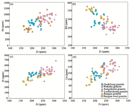 Diagrams for Longchahe granite: (a) Ba vs. Zr; (b) Rb vs. Zr; (c) Sr vs. Zr; (d) La vs. Zr.