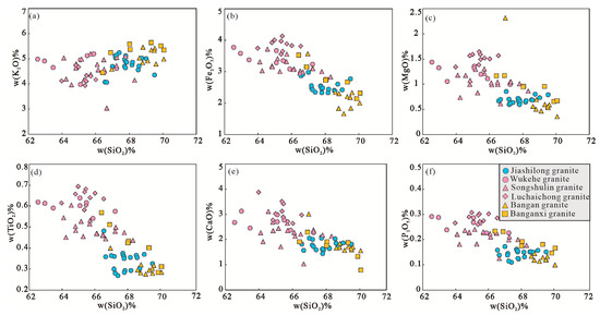 Chemical variation diagrams for major oxides vs. SiO2 contents for granitic rock samples from Longchahe pluton. (a) SiO2 vs. K2O; (b) SiO2 vs. Fe2O3; (c) SiO2 vs. MgO; (d) SiO2 vs. TiO2; (e) SiO2 vs. CaO; (f) SiO2 vs. P2O5.