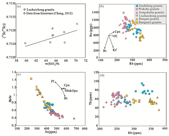 Discriminant diagrams of trace elements. (a) Plots of SiO2 vs. (87Sr/86Sr)i [14]; (b) Rb vs. Ba diagram; (c) Sr vs. Rb/Sr diagram; (d) Rb vs. Th diagram.