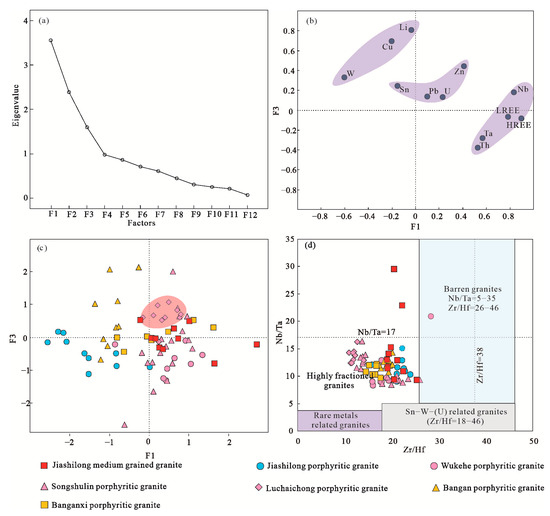 (a) A scree plot of ore-forming element(s) (the x-axis represents factors, with F1 indicating the largest characteristic root and the highest coefficient of determination. The y-axis represents eigenvalues (Eigenvalues) or the proportion of explained variance. The larger the eigenvalue, the more data variability the principal component or factor can explain); (b) factor loading diagram of ore-forming element(s); (c) factor score diagram of ore-forming element(s); (d) Zr/Hf vs. Nb/Ta [60].