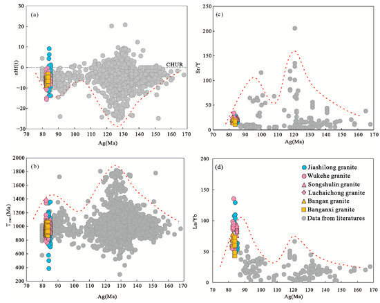 In conclusion, the two-stage model ages of all samples of the Longchahe pluton were found to conform to a normal distribution, while the εHf(t) values vary widely (Figure 7b). Except for the sample of Jiashilong, the other samples were typically less than 0. The εHf(t) values of the Jiashilong porphyritic granite samples were determined to be between −13.79 and −1.35, while the εHf(t) values of the medium-grained granites from Jiashilong range from −13.80 to 9.17 (Figure 7a).