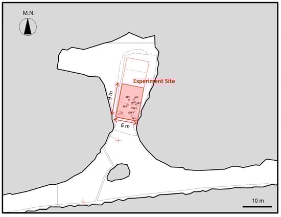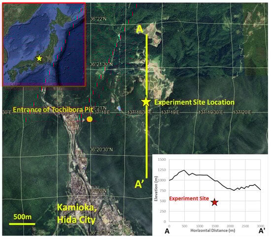 In the Tochibora pit of the Kamioka Mine in Hida City, Gifu Prefecture, central Japan (Figure 1), the experiment was conducted inside a branch of the mine drift. The experimental site floor was elevated at 520 m, the elevation of the top surface at the experimental site was 985 m, and the overburden was estimated at 465 m. The experimental site was set up in an open space in the branch of the mine drift, with area dimensions of 6, 9, and 5 m in width, length, and height, respectively (Figure 2).
