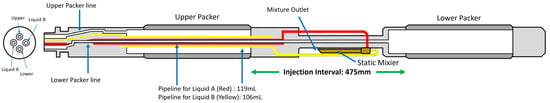 A special packer was used for the resin fracturing experiments. As mentioned above, the resin used in the outcrop experiment was coagulated by mixing the two liquids in equal amounts. The experimental equipment was designed to feed the same amount of the two liquids into the packer through separate flow lines, mix them in the packer, and discharge them through a static mixer set at the outlet. Figure 3 shows the internal structure of the double packer. The packer (Inflatable Packers International Pty Ltd. (IPI), Sharjah, United Arab Emirates) had four lines to flow the liquids, two lines to send the resins, and two lines to send water to expand the upper and lower packers. The lines for the resins are connected to the static mixer outside. The injection interval was 475 mm, and the pressure resistance was 50 MPa. The liquid flow pressure and packer pressure were measured using a pressure measuring box (OYO Geo-monitoring Service Corporation, Kawaguchi-shi, Japan), which was installed in the upper part of the packer.