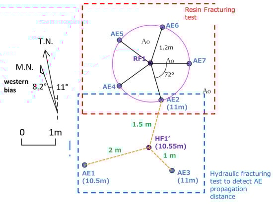 Recording several AE waveforms with large amplitudes was necessary to read the exact time of the first P-wave arrival and determine the event locations. However, AE is affected by anelastic and geometrical spreading attenuation as it propagates through the rocks; its amplitude decreases exponentially with propagation distance. Therefore, hydraulic fracturing tests using water were conducted to examine the degree of AE attenuation in advance and plan the arrangement of AE observation boreholes for resin fracturing tests. For the hydraulic fracturing test using water, a hydraulic fracturing borehole (HF1′) and three AE observation boreholes (AE1–AE3) were drilled vertically to a depth of approximately 11 m, with coring performed using a 76 mm diameter hole. Each AE observation borehole was spaced 1, 1.5, and 2.0 m from the HF1′ and spaced approximately 120° rotation around HF1′ (Figure 4). Based on the hydraulic fracturing test, the optimal AE sensor distance from the hydraulic fracturing hole was determined to be 1.0 m.