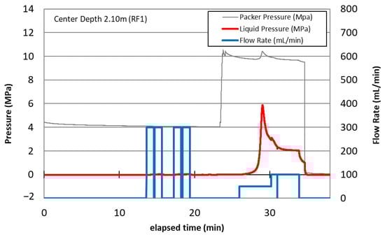 Resin fracturing tests were conducted at two depths, 2.10 and 3.30 m. Figure 5 and Figure 6 show liquid pressure, flow rate, and packer pressure during the experiment at the two depths. Figure 5 shows the behavior of pressure and flow rate during resin injection at a depth of 2.10 m. The experiment started by expanding the lower packer, and then 1.3 L of resin was filled in the injection interval, which was sealed by expanding the upper packer. The resin was injected with an initial flow rate of 50 mL/min at 26 min in the elapsed time for fracturing; then, a rapid decrease in liquid pressure indicated the occurrence of breakdown at 3 min and 5 s after the start of resin injection, when the liquid pressure reached 5.86 MPa. The flow rate was increased to 100 mL/min, 1 min after breakdown, and resin injection continued for 3 min and 43 s. The total injected resin volume was 600 mL, and the total injection time was 7 min and 57 s. The initial flow rate of 50 mL/min was chosen to slowly generate hydraulic fractures, allowing for accurate observation of AE events that occur during fracture propagation. Subsequently, we increased the flow rate to 100 mL/min to gradually expand the hydraulic fractures.
