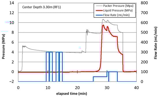 Following the same procedure as at a depth of 2.10 m, resin was injected at an initial flow rate of 50 mL/min 25 min into the elapsed time for fracturing at a depth of 3.30 m, as shown in Figure 6. Breakdown occurred 3 min and 26 s after the start of resin injection, indicating a breakdown pressure of 9.50 MPa. The flow rate was increased to 100 mL/min for 1 min and 10 s after breakdown, and resin injection continued for 3 min and 33 s. The total injected resin volume was 600 mL, and the total injection time was 8 min and 9 s.