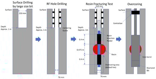 After the resin fracturing test, a 205 mm diameter core was recovered by drilling coaxially around RF1, that is, overcoring, as illustrated in Figure 7. We selected the 205 mm core size for the following reasons: (1) to recover a larger core than a meter-sized core, (2) to be able to handle the core on-site, and (3) because we had prior experience recovering cores of this size for rock stress measurement using stress relief with overcoring. The procedure was as follows: