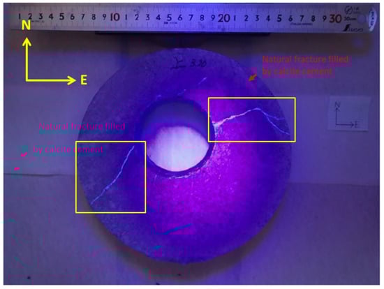 Photograph of recovered core after resin fracturing test under black light (3.10 m).