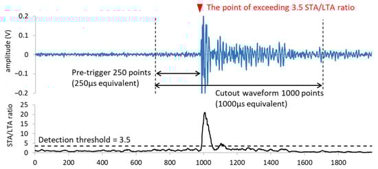 First, AE events were extracted from the recorded continuous waveforms using the short-term average/long-term average (STA/LTA) ratio detection method described by Naoi et al. 2018 [17]. We calculated the STA for 20 points and the LTA for 1000 points of the continuous waveform, searching for a “trigger point” where the STA/LTA ratio exceeded 3.5. The AE waveform, 1000 points in length, was then cut from the continuous waveform starting at 250 points before the trigger point (Figure 11). This process was repeated until the continuous waveform was obtained for all 24 sensors. AE was defined as a group of temporally close trigger points across multiple sensors. Thus, we considered trigger points within 1000 μs at each sensor as a single AE event.