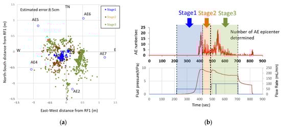 (a) Distribution of AE hypocenters during the fracturing at the center depth of 3.30 m. (b) Stages of fluid injection.