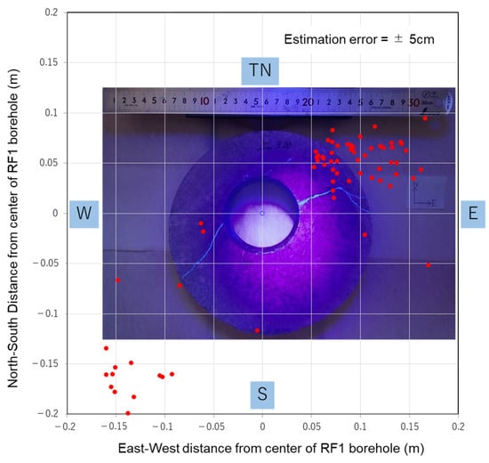 Comparing the direction of the resin-filled fracture and the distribution of AE hypocenters, the distribution of the hypocenters in the area very close to RF1 showed an ENE-WSW trend, consistent with the direction of the resin-filled fracture on the recovered core (Figure 13). The direction of the maximum principal stress, which was estimated from hydraulic fracturing, mainly followed a WSW to NE-SW trend (Table 1). The direction of the resin-filled fractures is consistent with this result. Therefore, the maximum principal stress direction at this depth was presumed to follow an ENE-WSW trend, and the direction of the resin-filled fracture was reflected in the local stress during the initial stage. However, the AE hypocenters at a depth of approximately 1 m from RF1 were distributed along the NEN-SWS trend following the long axis (left of Figure 12). This result indicates that fracture extension is affected by changes in stress conditions, natural fractures, and the heterogeneity of the bedrock.