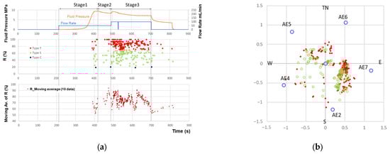 The AE events were then classified into tensile failure, shear failure, and fracture closing based on the ratio of the number of first compressional motions to the total number of polarities that could be distinguished by all sensors (R-value), following Ishida et al. 2021 [19]. In this study, the AE events were classified as follows: tensile (Type T), R-values greater than or equal to 80%; shear (Type S), R-values between 20% and 80%; and closure (Type C), R-values less than 20% (Figure 14). Examining the occurrence times of each type, Type T was predominant immediately after the breakdown, followed by Type S in Stage 1. The moving average of the R-value showed periodicity, indicating that Type T occurred first when the AE activity area expanded, followed by Type S. The horizontal distribution of the hypocenters showed several clusters of AE events. Each cluster exhibited a pattern in which Type T events were predominantly distributed in the outer part of the cluster, whereas Type S events were concentrated in the inner part.
