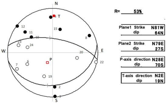 Example of fault plane analysis (lower hemisphere of Schmidt net projection).