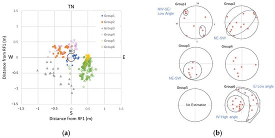 (a) Grouping of acoustic emission events; (b) distribution of P-axis for each group.