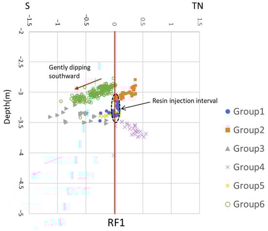 Failure mechanism estimation and categorization of AE were performed as described in Section 3.4. In the fluid injection time series, Type T (tensile) and Type S (shear) events occurred at every stage (Figure 14). In theory, Type T should occur intensively just after breakdown, and Type S follows thereafter because Type T events are assumed to occur when hydraulic fractures are opened by the injected fluid, although such a trend was not observed. In addition, the distribution of Type T fractures did not represent a clear outline of fracture growth. This suggests that fracture growth is a complex mechanism. The directions of the stress axes that caused shear failure (Type S events) were estimated using fault plane analysis. The P-axis direction of Group 1, distributed in the AE clusters near the RF1 area, was estimated to have an NW-SE trend (Figure 16). The direction was perpendicular to the direction of the resin-filled fracture on the cross-section of the core at 3.30 m (ENE-WSW trend). Therefore, the Type S AE event of Group 1 is expected to occur owing to the compressional stress caused by the pushing of the bedrock due to the opening of the induced fracture. The P-axis directions of Groups 2–5 show various trends; therefore, it is difficult to consider the mechanisms of the AE that occurred at this time. Group 6 was a characteristic cluster generated in a remote area southwest of the RF1. The AE cluster of Group 6 resembled a plane gently dipping southward in the vertical cross-section (Figure 17). The characteristics of this gently tilted horizontal plane are similar to those of the resin-filled fractures created by resin fracturing at a depth of 2.10 m. Group 6 fractures occur at a shallower depth than the resin injection interval (Figure 17), which indicates that the resin reached a shallow depth and the stress condition became similar to that at 2.10 m, leading to the creation of a horizontal fracture. However, the AE distribution of Group 6 extended in the north–south direction rather than spreading across the area (Figure 16). This suggests the presence of natural fractures with an N-S strike trend. The P-axes of Group 6 exhibited two distinct trends: in the west direction with high dip angles and the east direction with low dip angles. Considering the above, the AE events of Group 6 were generated by a combination of reactivating N-S trend natural fractures with a high angle and reopening low-angle natural fractures due to low vertical stress.
