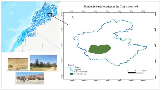 The Boudenib Oasis is the largest palm grove in the southeastern region of Morocco, located within the Guir watershed, close to the Moroccan–Algerian border. The region, characterized by an arid climate, faces significant water resource shortages and relies on irrigation from dams [1]. This oasis has recently been the subject of agricultural and hydrological studies due to growing concerns about water scarcity and stress [2]. These challenges, including recurrent droughts and poverty, threaten one of the country’s most vital ecosystems, which is also listed under the Ramsar Convention [3].