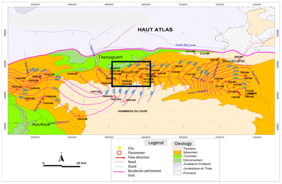 - Tlemcani, J.; Hilali, M.; Mahboub, A.; Moudden, H.; Outaleb, A.; Boumeshoul, S.; Outaleb, A.; Boumeshoul, S. Hydrogeology and groundwater modeling of the Boudenib senonian aquifer (Southeastern Morocco). Environ. Water Sci. Public Health Territ. Intell. J. 2019, 3, 221–230. Available online: https://revues.imist.ma/?journal=ewash-ti/ (accessed on 4 April 2022).