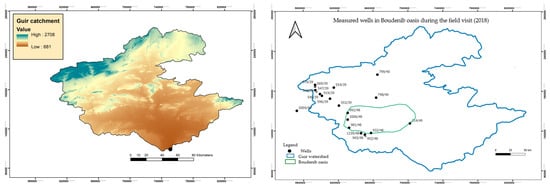 Wells where the piezometric measurements were taken (Boudenib oasis and Guir watershed). Digital elevation model (DEM) of the Guir catchment (https://earthexplorer.usgs.gov/, accessed on 21 January 2025). Ordinate unite (km).