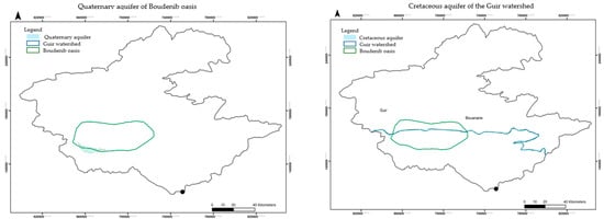 Data obtained from ABHZGR-Errachidia identified two aquifers within the Guir catchment area (Figure 4). These aquifers primarily belong to the Cretaceous and Quaternary geological periods, providing valuable groundwater resources for the region; however, Boudenib oasis is primarily located over the Quaternary aquifer which is relatively recent in geological terms and formed by the deposition of alluvial materials like sand and clay. This aquifer is the dominant source of groundwater in the Boudenib oasis.