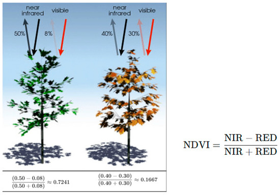NDVI physical functionality (https://gisgeography.com/ndvi-normalized-difference-vegetation-index/, accessed on 21 January 2025).