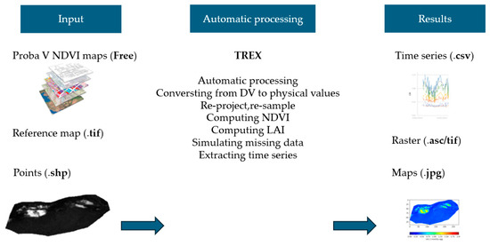TREX, developed at the Vrije Universiteit Brussel (VUB), is an algorithm written in Python that processes hundreds of PROBA-V satellite images into maps with user-specified spatial resolutions and projections. PROBA-V, a small satellite launched by the European Space Agency (ESA) and managed by the Flemish Institute for Technological Research (VITO), provides daily NDVI maps at multiple spatial resolutions (100 m, 300 m, and 1 km) [19]. These PROBA-V images, which include NDVI maps and status maps, can be requested for free through the VITO Earth observation portal (https://www.vito-eodata.be/PDF/portal/Application.html#Home (accessed on 10 May 2021)). The development and application of TREX were the result of close collaboration within our research team, aiming to refine its capabilities for vegetation monitoring. Its implementation in this study aligns with our department’s objective of testing and expanding TREX’s applicability in arid environments. This collaboration has been instrumental in enhancing the tool’s accuracy, particularly in handling remote sensing challenges such as cloud contamination and atmospheric corrections. Moreover, there are very few software solutions or platforms that enable the automatic processing of remote sensing products without requiring extensive GIS analysis and imagery treatment. These tools streamline the generation of NDVI and LAI maps, making remote sensing analysis more efficient and accessible.
