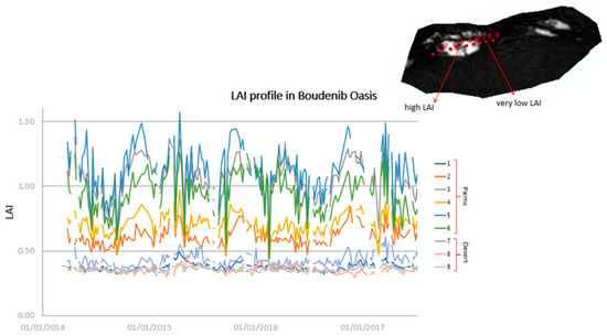 The variability in the Leaf Area Index (LAI) profile across the extraction points (Figure 11) provides valuable insights into the evolution of this key eco-physiological parameter. Palm trees, which predominantly grow along streams and irrigated areas, rely on water sources supplied by geological faults and structural features originating from the High Atlas Mountains. Consequently, points 1 through 6 exhibit significant dynamic variability in LAI, reflecting the favorable conditions for palm tree development in these regions. In contrast, points 7, 8, and 9, located in a desert area, show LAI values approaching ~0, indicating minimal vegetation due to arid conditions. These findings underscore the critical role of LAI in influencing palm tree yield, both in terms of quality and quantity, and highlight its sensitivity to water availability and environmental conditions.