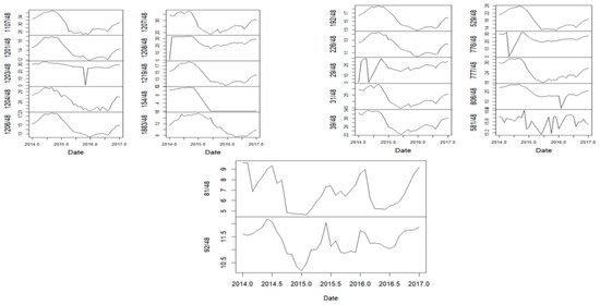 Figure 12 illustrates the evolution of groundwater levels (piezometric levels) in the Boudenib oasis from 2014 to 2017, revealing key trends and patterns. Most graphs display gradual declines in water levels over time, indicating the depletion of groundwater resources due to recurring environmental and climatic factors, such as rising temperatures and reduced precipitation. However, some plots exhibit stable or slightly increasing trends, which can be explained by seasonal changes linked to rainfall or irrigation cycles, where groundwater recharge occurs during wet seasons. Notably, the piezometric levels show an increase in 2015 for the majority of the wells, likely reflecting temporary recharge events or improved water management practices. Some time series include flat sections, which may indicate periods of no data collection, interpolation, or static conditions where groundwater levels remained unchanged. These findings highlight the complex interplay between climatic variability, seasonal recharge, and anthropogenic pressures on groundwater resources in arid regions. The results underscore the need for sustainable water management strategies to mitigate groundwater depletion and ensure the long-term resilience of the Boudenib oasis. In terms of the statistical significance of trends, we can visually conclude (Figure 12) that some series show persistent increases or decreases over time while others exhibit short-term fluctuations without a consistent trend, and finally, the presence of sharp dips or peaks suggests potential structural breaks or nonlinear relationships.