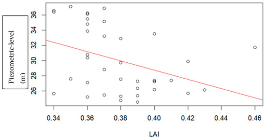 Linear regression model for time series of yearly averaged LAI and piezometric level for the period (2014–2017).
