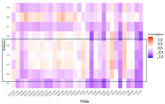 The distribution of colors in Figure 15 looks approximately equal; purple areas indicate a negative monotonic correlation between the piezometric level of certain wells and LAI, which means that when LAI increases the PL decreases; however, orange indicates a positive monotonic correlation which means when the LAI decreases, the PL also decreases, thus confirming the hypothesis of this research.