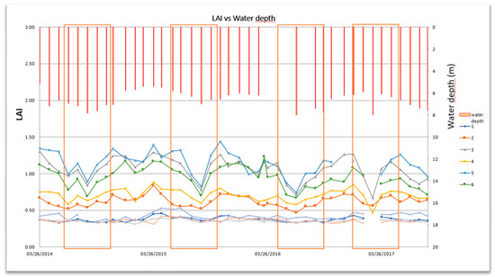 LAI vs. Water depth data: The water depth of wells in the Boudenib oasis, as measured during the sampling campaign, does not exceed ±40 m, indicating that the water is primarily extracted from the shallow Quaternary aquifer, which contains fresh, potable water. However, excessive pumping in the region has led to a decline in water availability, adversely affecting irrigation for palm trees. To analyze this trend, monthly averaged time series of piezometric levels (PL) for wells in the Boudenib oasis were obtained from the Watershed Agency (ABHZ) for the period 2014–2017 and compared to monthly averaged time series of LAI for the same period.