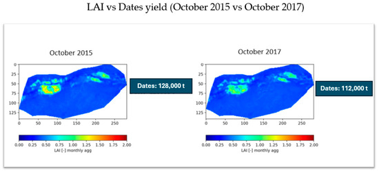 LAI vs Dates yield (October 2015/October 2017): In Morocco, the date harvest season typically occurs in October [28]. To assess the relationship between vegetation health and date production, Leaf Area Index (LAI) time series values were compared with date yield data for 2015 and 2017, as these years were identified as significant for date production in the country. In 2015, date production reached a high yield, whereas in 2017, production declined by 12% compared to 2015 (Figure 17). LAI experienced a decline in that same year. This reduction in yield was accompanied by a decline in LAI and quality, which was attributed to several factors including insufficient precipitation, reduced nutrient availability from palm leaves, and the overexploitation of groundwater resources due to excessive pumping—a critical issue in the region.