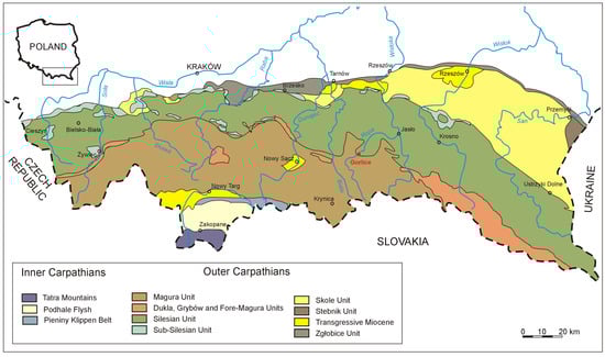 - Kosakowski, P.; Więcław, D.; Kotarba, M.J. Source rock characteristic of the selected flysch deposits in the transfrontier area of the Polish Outer Carpathians. Geologia 2009, 35, 155–190. (In Polish) [Google Scholar]