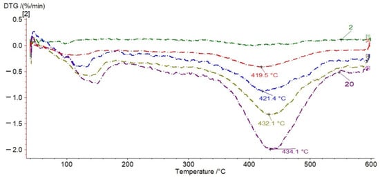 When analyzing the decomposition of bulk rock samples at different heating rates, it can be observed that the mass loss between 250 and 600 °C is not highly variable, remaining within a range of 13–14%. The general trend indicates that higher heating rates result in lower total weight loss due to sample decomposition. At a heating rate of 2 °C min−1, decomposition occurs as a continuous process, and the DTG curve shows no visible inflection. As the heating rate increases, the peaks become more distinct, and the temperature at which the maximum decomposition rate (Tp) occurs shifts to higher values: from approximately 420 °C at a heating rate of 5 °C min−1 to 434 °C at a heating rate of 20 °C min−1.