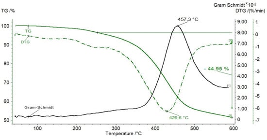 In the experiments on source rock kerogen, this decomposition scheme is consistent, as evidenced by the Gram–Schmidt curve, which illustrates the amount of gas evolved during kerogen degradation (Figure 3). It is also noteworthy that the temperature of the maximum reaction rate (Tp), determined from the DTG curve, is lower than the temperature at which the highest gas evolution occurs. In the case presented in Figure 3, at a maximum heating rate of 20 °C min−1, these temperatures are 429.6 °C and 457.3 °C, respectively.