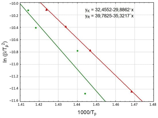 Peak reaction rate temperatures (Tp) and corresponding heating rates (β) plotted in accordance with the Kissinger equation. Red triangles—kerogen; green circles—bulk rock.