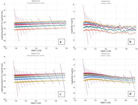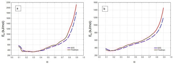 The KAS kinetic method (Equation (6)) is an integral isoconversional method, where the activation energy is a function of the conversion degree of a chemical reaction, and can be applied without any assumption concerning the kinetic model.