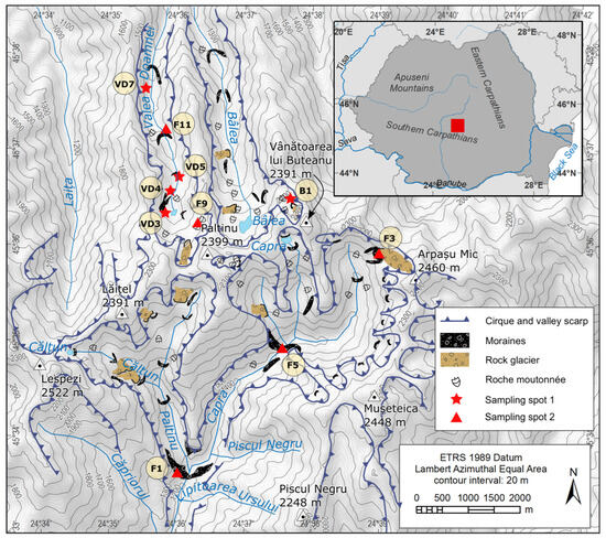 The landscape in the study area is dominated by glacial and periglacial relief [3,5,24]. The modern temperature–precipitation equilibrium-line altitude exceeds 3100 m asl across the entire Southern Carpathians [6], exceeding the peak height of the entire range, so nowadays, no glaciers exist in the Făgăraş Mts. However, a glacially sculptured landscape prevails above 2000 m asl, and landforms indicating former glacial erosion can be observed as low as ~1100 and ~1200 m asl [4]. Relatively well-preserved terminal moraines of former valley glaciers can be found only on the upper part of the glacial valleys, above ~1400 m elevation, and in the cirque areas in both the northern and the southern valleys (Figure 1). Landforms of glacial erosion, like striated bedrock and walls, roches moutonnées and overdeepened depressions, are also typical in this area [24]. Glaciokarstic landforms were described in the Mușeteica and Râiosu cirques [25,26] to the southeast of the study area.
