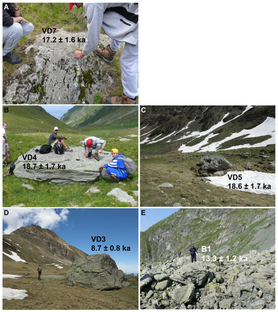 Photos of the sampled boulders and bedrock surface with the sample code and the estimated CRE age with external uncertainties. (A) polished rock surface providing VD7 sample, (B) erratic boulder providing VD4 sample, (C) erratic boulder providing VD5 sample, (D) solitary boulder providing VD3 sample, (E) morainic boulder providing B1 sample.