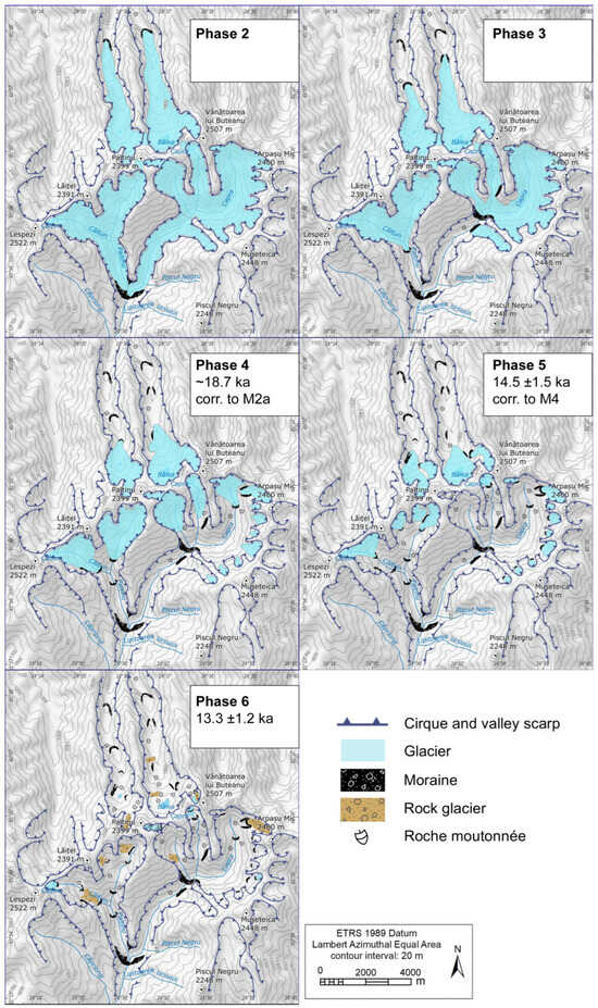 Reconstructed glacier extents during the phases of the last deglaciation in the central Făgăraș Mts. Inferred CRE ages of the last three phases are indicated. The assumed correspondence of Phase 4 and Phase 5 to the major glaciochronological stages of the Retezat Mts is also marked in the corresponding panels.