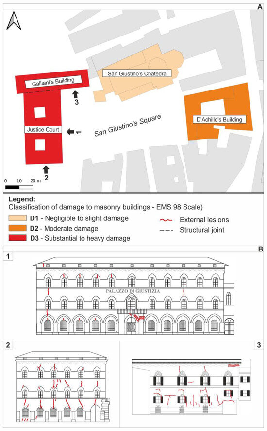 (A). Damage levels suffered by buildings in San Giustino’s Square due to the 2009 L’Aquila earthquake. External cracks in the front elevation (B1) and in the side elevation (B2) of the Justice Court and those related to the south elevation of the Galliani’s building (B3).